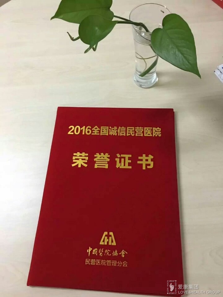 黃石市愛(ài)康醫(yī)院“2016全國(guó)誠(chéng)信民營(yíng)醫(yī)院”獎(jiǎng)證書(shū)