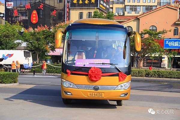 活動當天早上8:00班車從廟崗鄉(xiāng)衛(wèi)生院駛出,接上病人一路經(jīng)過柘皋鎮(zhèn)、夏閣鎮(zhèn)開往宋慶齡愛心醫(yī)院,臨近醫(yī)院大門已然聽到鑼鼓腰鼓震天響,班車駛進醫(yī)院大門,已見門診大樓前積聚了百余名市民朋友前來圍觀,無不烘托出濃濃的喜慶氛圍。