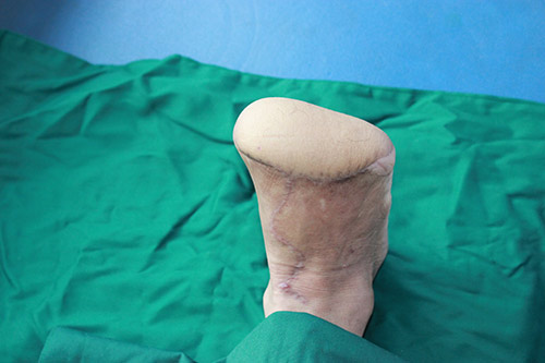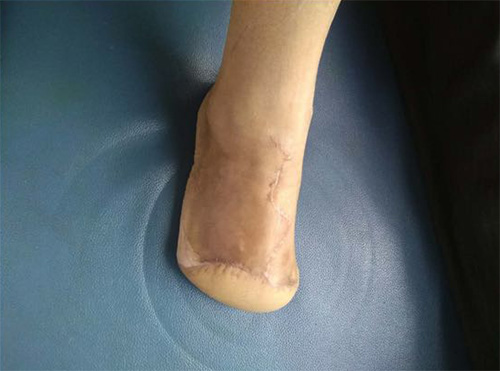 隨后,蔣主任以及他的團(tuán)隊(duì)通過(guò)高超的顯微外科技術(shù)“移花接木”將患者大腿上的“肉”移植到受傷的足部,保護(hù)了患者的骨頭,讓患者以后能正常行走。據(jù)蔣主任回憶并介紹,術(shù)前患者的足背自跖骨遠(yuǎn)端以遠(yuǎn),足底自中部以遠(yuǎn)壞死伴有滲出及異味,在術(shù)中他對(duì)著采取了再植手術(shù),將旋股外側(cè)動(dòng)脈穿支皮瓣游離移植修復(fù)前足復(fù)合組織缺損區(qū),在顯微鏡下縫合,保留第1、5跖趾關(guān)節(jié)及第2、3、4跖骨,保留了患肢的行走功能。手術(shù)過(guò)程很順利,術(shù)后皮瓣順利成活,供區(qū)只遺留線形疤痕。