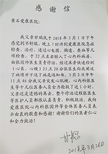 事后,醫(yī)院特意電話回訪了送來感謝信的家屬。作為逝者的兒子,甘先生這樣說:“我對(duì)父親感情很深,他一貫身體不錯(cuò)沒去醫(yī)院,事情發(fā)生那么突然,我簡直難以接受,當(dāng)時(shí)怎么說我也不相信會(huì)是這個(gè)結(jié)果,想到的就是你們?cè)\斷錯(cuò)了沒,搶救治療盡力沒。說實(shí)話吧,復(fù)印病歷以后我咨詢了很多業(yè)內(nèi)人士,包括我家當(dāng)醫(yī)生的親戚,他們?nèi)空J(rèn)為整個(gè)診斷、治療過程無過錯(cuò),我這才打開心里那個(gè)結(jié)。反過來一想到當(dāng)時(shí)心血管內(nèi)科醫(yī)生那么盡力救治,尤其是張國帥醫(yī)生的言行舉止,既專業(yè)又不失人文關(guān)懷,太讓我感動(dòng)了。已經(jīng)快一個(gè)月了,我覺得是時(shí)候給你們一個(gè)評(píng)價(jià)了!”