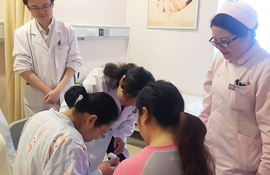 劉霞主任、董艷紅護士長指導產(chǎn)婦疏通乳腺