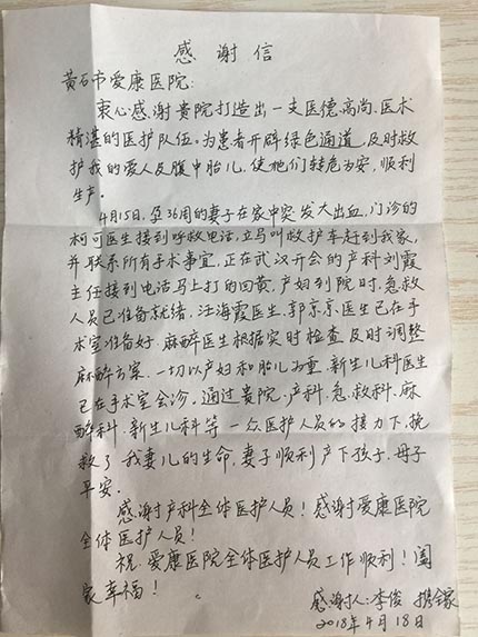 母子平安,蔣女士和家人都有種劫后余生的欣喜,但回憶起三天前的經(jīng)歷,她仍心有余悸,“要不是遇到了愛康醫(yī)院這群訓練有素、冷靜專業(yè)的醫(yī)務(wù)人員,同時開辟了快捷入院并手術(shù)的綠色通道,我都不知道還有沒有機會坐在這個地方和你聊天了。”15日上午10點左右,已經(jīng)是懷第二胎的蔣女士獨自一人在家,本來離預(yù)產(chǎn)期還有20多天,卻突然出現(xiàn)腹痛并大量陰道流血,讓她一時間不知所措,因為就在前一天下午,她還出現(xiàn)過不規(guī)則下腹脹痛。短暫平復(fù)心情后,她立即給一直為自己做孕期檢查的黃石愛康醫(yī)院產(chǎn)科醫(yī)生柯可打電話,接到求助電話的柯可醫(yī)生立即通知急診科120救護車。接下來,就出現(xiàn)了新聞開頭那一幕。