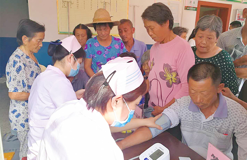圖為義診活動現(xiàn)場,愛康護(hù)理團(tuán)隊為村民測量血糖、血壓