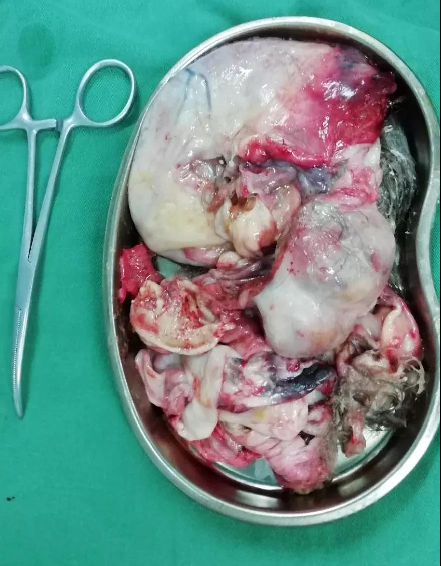 相信大家都有這樣一個疑問,如此大的盆腔包塊是如何從僅有三厘米的切口取出來的呢?王教授的答案是:將包塊打碎后化整為零,最終順利取出包塊。