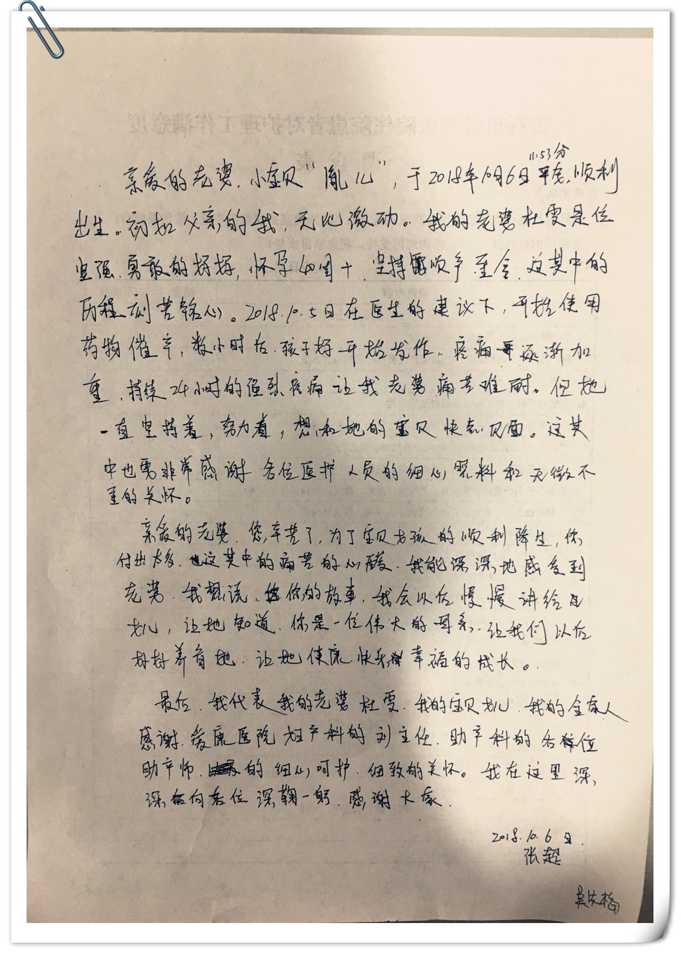 “精湛的醫(yī)療技術(shù)治病救人,高尚的醫(yī)德醫(yī)術(shù)使人心暖。愛康產(chǎn)科將人文關(guān)懷貫穿到每個(gè)治療和護(hù)理的細(xì)節(jié),從心理到身體,讓每個(gè)產(chǎn)婦都能感受到溫暖和關(guān)懷。”10月6日,在愛康產(chǎn)科順利生產(chǎn)后,小杜的愛人一筆一畫寫下了這封感謝信,將孕育期間和分娩期間醫(yī)務(wù)人員對(duì)其愛人的幫助,都記錄下來(lái),并對(duì)醫(yī)務(wù)人員表示了深深的感謝!他還在信中提到“住院期間,我們得到了醫(yī)生和護(hù)士們無(wú)微不至的關(guān)照,特在此表示感激。感謝以劉霞、郭京京主任等帶領(lǐng)的大夫團(tuán)隊(duì)和護(hù)理團(tuán)隊(duì),她們這群白衣天使,善良與責(zé)任感同在,像朋友,更像親人,讓我們體會(huì)到了家的溫暖,他們的敬業(yè)之心讓人欽佩。”