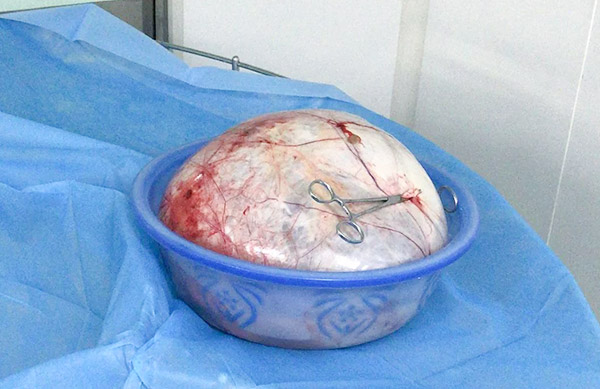 婦瘤科主任王洪寶專家團(tuán)隊(duì)為盧女士制定了科學(xué)的治療方案,在與患者及家屬充分溝通之后,盧女士家屬簽下了手術(shù)同意書。于2019年1月9日上午9:30采用“腹腔鏡探查術(shù)”,手術(shù)時(shí)間約一個(gè)小時(shí)。手術(shù)過程很順利,術(shù)中在盧女士腹部取出一個(gè)28斤的巨大盆腔包塊。手術(shù)結(jié)束后,盧女士家屬在手術(shù)間門口焦急而耐心的等候,當(dāng)家屬看見裝滿整個(gè)臉盆大小盆腔包塊時(shí)候,流下了心疼而欣慰的淚水。