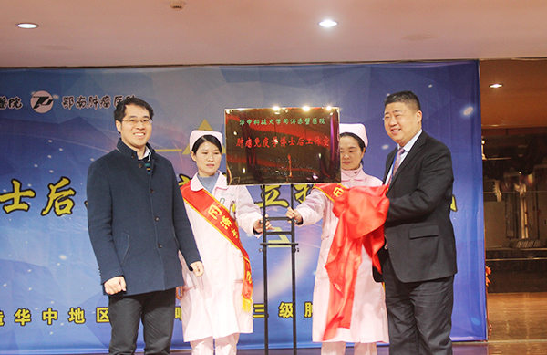 同濟總院腫瘤中心教授趙荊和同濟赤壁醫(yī)院總裁楊治國共同為博士后工作室揭牌