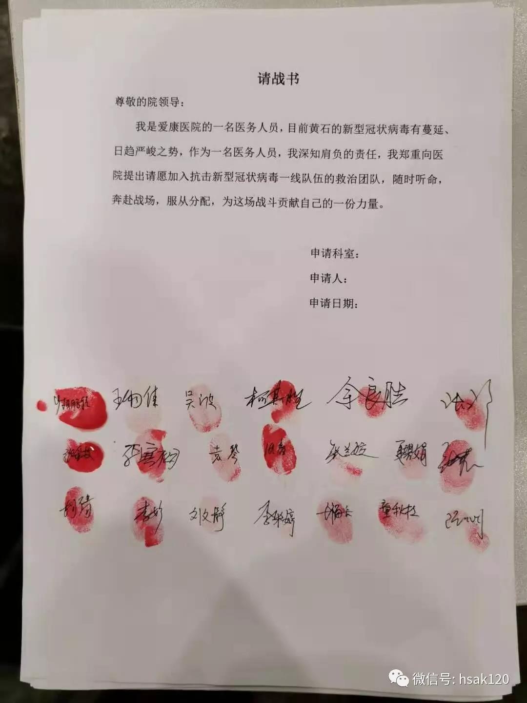 1月30日,按照黃石市疫情防控指揮部安排,黃石市中醫(yī)醫(yī)院作為定點醫(yī)院,集中收治新冠肺炎病人,成為黃石“小湯山”,并號召市各醫(yī)院醫(yī)護(hù)人員前往馳援。“我自愿請戰(zhàn)……”眾多愛康醫(yī)務(wù)人員主動請戰(zhàn),并在請戰(zhàn)書上按下鮮紅的指印。呼吸與危重癥醫(yī)學(xué)科醫(yī)生胡俊芳也在第一時間報名,由于名額有限,申請了好幾次才如愿,她也成為愛康馳援“小湯山”隊伍中唯一的女醫(yī)生。