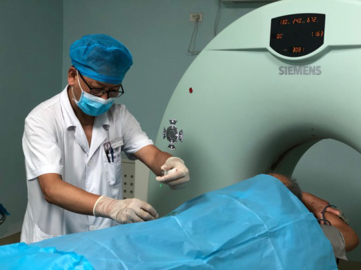 入院后,在做完相應(yīng)的術(shù)前準備后,患者接受了介入治療。此次手術(shù)是在CT引導(dǎo)下進行的,經(jīng)皮腎囊腫穿剌抽吸硬化介入治療。躺在CT檢查床上,可以看出患者還是有些緊張的。