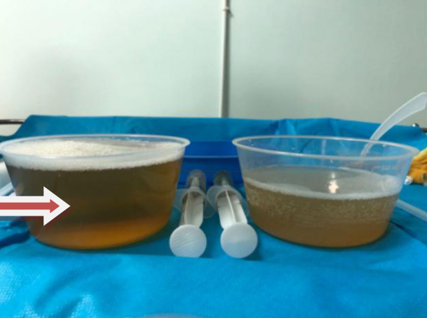 隨后,醫(yī)生又給患者囊腫內(nèi)反復(fù)注入、抽出硬化劑(無水酒精),對其囊腔進行沖洗,最后抽出的液體,竟然就好似豆腐花一樣。而此時,手術(shù)就結(jié)束了,整個過程中,患者幾乎沒有任何痛苦,只是有一點酒后的輕微醉意。