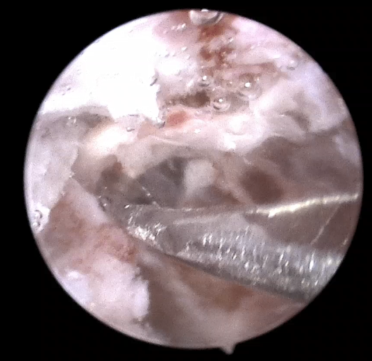洪主任沒有采用傳統(tǒng)顯微鏡手術(shù),而是選用了從外耳道進(jìn)入,不破壞耳朵結(jié)構(gòu)、耳外無創(chuàng)傷、手術(shù)視野更開闊的耳內(nèi)鏡下手術(shù)。術(shù)中,耳內(nèi)鏡從外耳道上壁和后壁進(jìn)入,顯示屏上顯示醫(yī)生視角可達(dá)120度,并且直接抵近膽脂瘤。