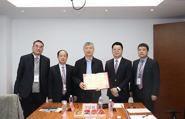 會(huì)上集團(tuán)高級(jí)副總裁王冠南受董事會(huì)委托,向李培根院士頒發(fā)了聘書,李培根院士愉快地接受聘書并和集團(tuán)董事會(huì)成員影留念。